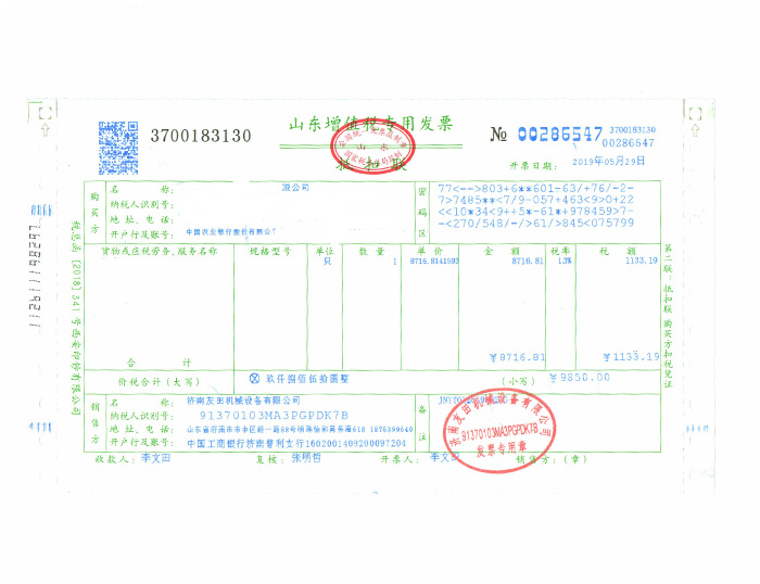 友田機(jī)械設(shè)備 發(fā)票展示